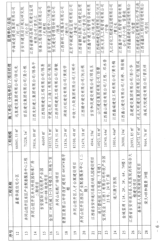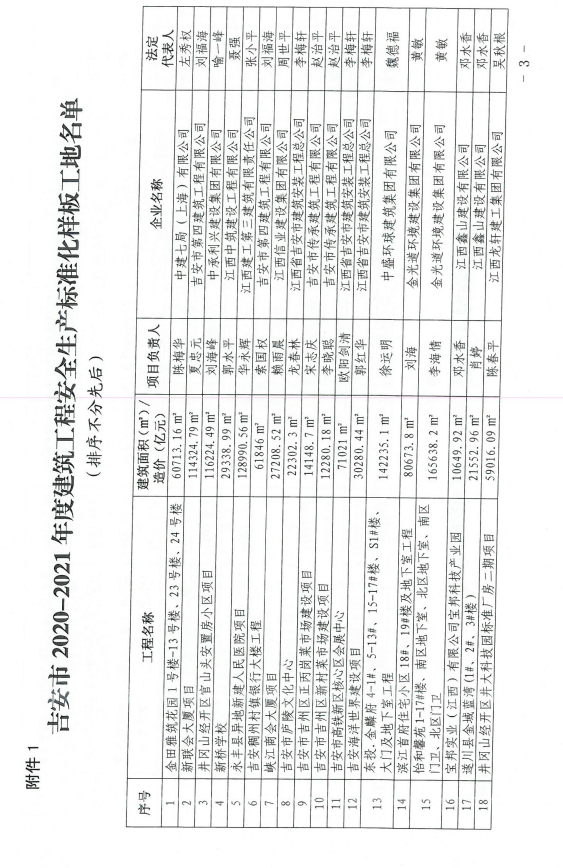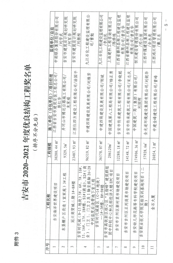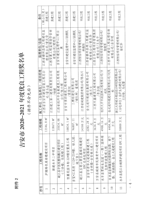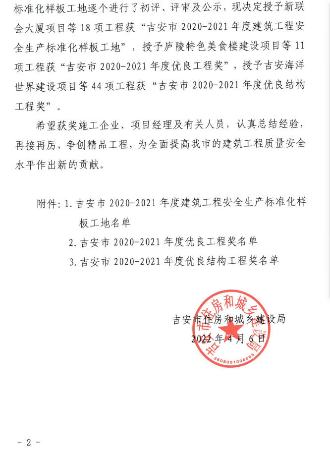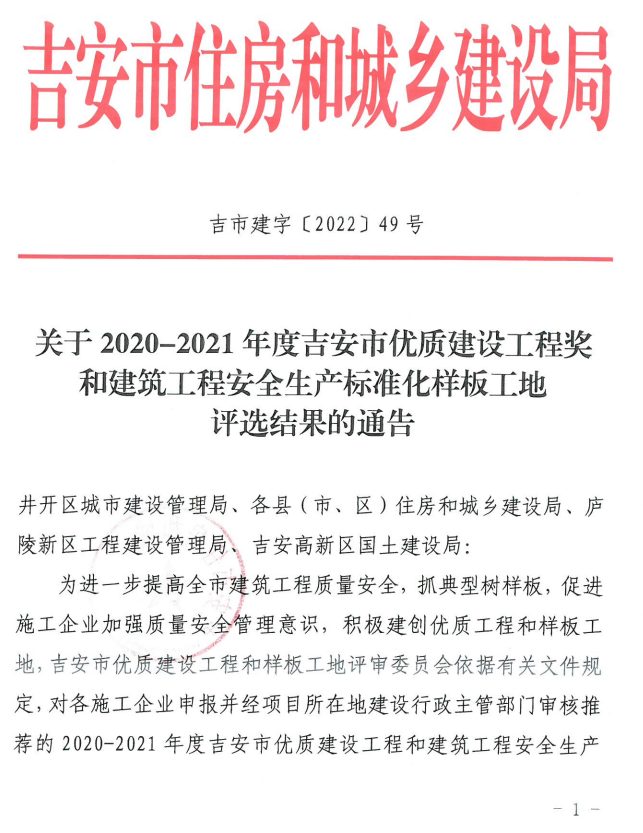 2020-2021年度吉安市优质建设工程奖和建筑工程安全生产标准化样板工地评选结果的通告
